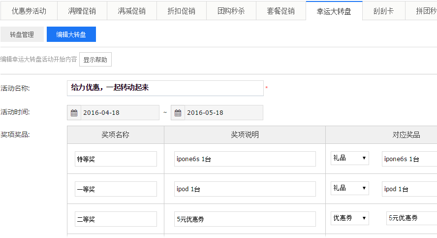 大轉盤為商家提供轉盤抽獎服務,商家只需設置活動時間、活動規則、活動獎品等信息就能發起活動,粉絲進入活動界面,點擊開始抽獎,即有幾率獲得不同類型的獎品。