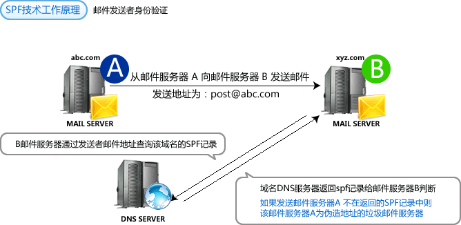這里的SPF是指Sender Policy Framework。翻譯過來就是發(fā)信者策略架構(gòu),比較拗口,通常都直接稱為SPF。在域名管理系統(tǒng)中對(duì)域名做一條以SPF格式為準(zhǔn)的txt記錄即為SPF記錄。
