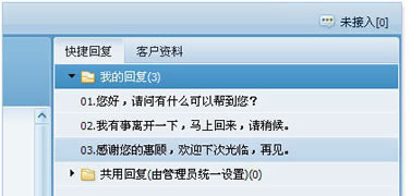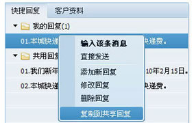 員工可設(shè)置部分常用的回復(fù)用語(yǔ)、禮貌用語(yǔ)等作為快捷回復(fù)語(yǔ)。使員工與客戶的溝通更快捷、更高效。 ![]() 快速回復(fù)功能除了員工自行設(shè)置快捷回復(fù)語(yǔ)之外,還支持快速回復(fù)內(nèi)容的共享,每個(gè)工號(hào)都可以在“我的回復(fù)”區(qū)域里右鍵點(diǎn)擊,將自己的快速回復(fù)內(nèi)容復(fù)制到共享回復(fù)中,便于其他工號(hào)在答復(fù)咨詢時(shí)使用。 ![]() 客戶資料:記錄來(lái)訪客戶詳細(xì)資料