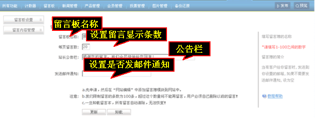 在留言本設置主要填寫留言板名稱設置每頁留言數設置站長公告欄設置發郵件通知(當有客戶給你留言時, 發送到您設置的郵箱, 如果不需要發送郵件通知, 設為空),點擊“更新”便完成留言板設置。