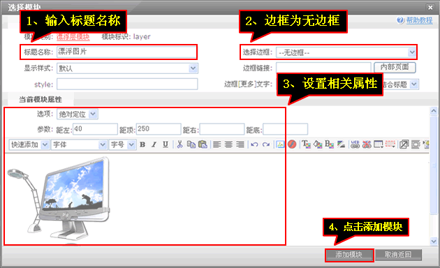 ”,通過設置參數調整漂浮內容的位置,漂浮內容可以自由編輯。