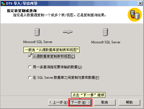 | 5. 選擇復(fù)制方式,一般選“從源數(shù)據(jù)庫(kù)復(fù)制表和視圖”,點(diǎn)“下一步”繼續(xù) | |