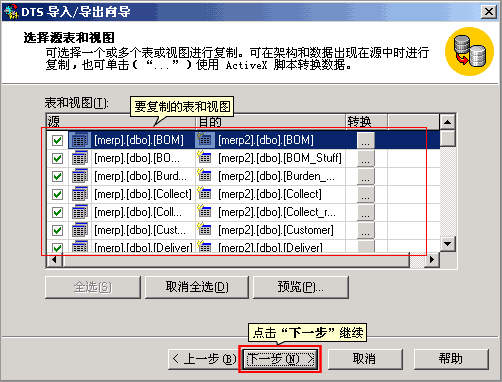 | 6. 選擇要復(fù)制的表和視圖,點(diǎn)“下一步”繼續(xù) | |