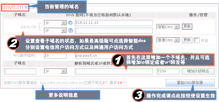 | 以下操作均以pay8.cn做為示例域名,請操作時結(jié)合自己的域名 域名申請成功后,默認有www.pay8.cn,pay8.cn兩個域名設置記錄,以及一個泛域名設置記錄。 1、如果要設置pay.cn/www.pay8.cn的解析,請在對應的文本框中輸入解析的ip地址,或者選擇cname以及轉(zhuǎn)發(fā)等分別設置 2、泛域名設置,要設置泛域名解析,請勾選泛域名記錄行后的“開啟”復選框即可設置泛域名功能 3、要設置其它的子域名,請在最下的文本框輸入子域名,并選擇解析或者轉(zhuǎn)發(fā)等,再設置好具體的地址后點“增加子域名”按扭既可增加成功,也可在增加成功后修改解析或者轉(zhuǎn)發(fā)地址。 4、高級版本的DNS管理系統(tǒng)具有智能DNS解析功能,增加子域名后,既可選擇智能DNS功能,此時同一個子域名就有“電信”和“網(wǎng)通”兩個不同的設置選項,您可以有針對的分別設置。 |