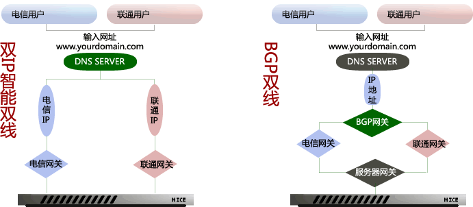雙IP智能雙線需要設(shè)置兩個IP地址,最佳訪問路由是由域名DNS服務(wù)器根據(jù)訪問者的登陸IP來確定的。 相比雙IP智能解析,BGP雙線服務(wù)器在骨干路由決定最佳路由時,有可能由于網(wǎng)間路由跳轉(zhuǎn)次數(shù)比較多,訪問的速度比雙IP智能雙線慢一點;而雙IP智能雙線由于是軟件決定,有可能由于軟件數(shù)據(jù)庫不完整或者IP數(shù)據(jù)的變更造成的自動識別錯誤。 總之BGP雙線與雙IP智能雙線各有千秋,各有優(yōu)勢,在解決中國南北電信問題上都充當(dāng)著重要的角色。 |